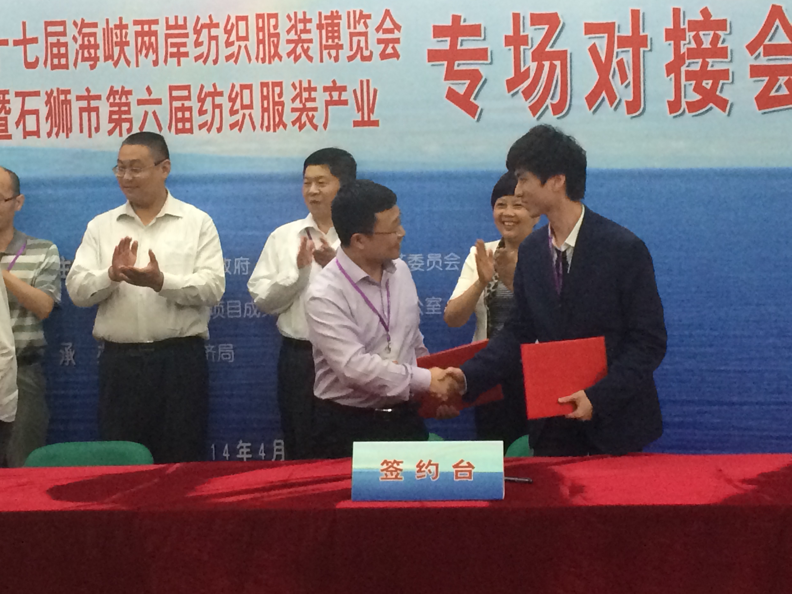 4月18日,第17届海峡两岸纺织服装博览会暨6·18第六届纺织服装产业专场对接会在海博会主展馆举行,该对接会由石狮市人民政府与泉州市发展和改革委员会、中国·海峡项目成果交易会组委会办公室共同举办,副市长庄宝玲出席了会议。我校环境工程学院院长夏东升教授代表武汉纺织大学环境工程学院与福建汉祥纺织科技有限公司就夏东升研究团队研发的纺织印染大规模废水资源化技术达成合作协议,计划总投资1200万元。该项目的签订标志着我校产学研发展步入一个新的阶段。