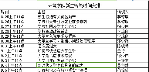 每晚8点,环境学院2014级新生群里都会热闹非凡,大家如火如荼的开展各种讨论。原来,从8月26日至9月12日每晚8点,由环境学院老师及主要学生干部组成的讲解团都会准点在线等候,根据不同主题来解答新生的各种疑惑。