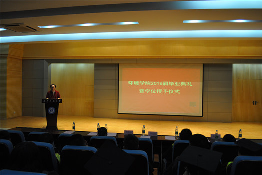 环境学院2016届毕业典礼暨学位授予仪式于6月5日晚在八栋学术报告厅华丽落幕。学院党委书记罗汉春、副书记张莎莎、副院长李进平、陈洪高以及各年级辅导员老师与毕业生一同度过了一个难忘的夜晚。