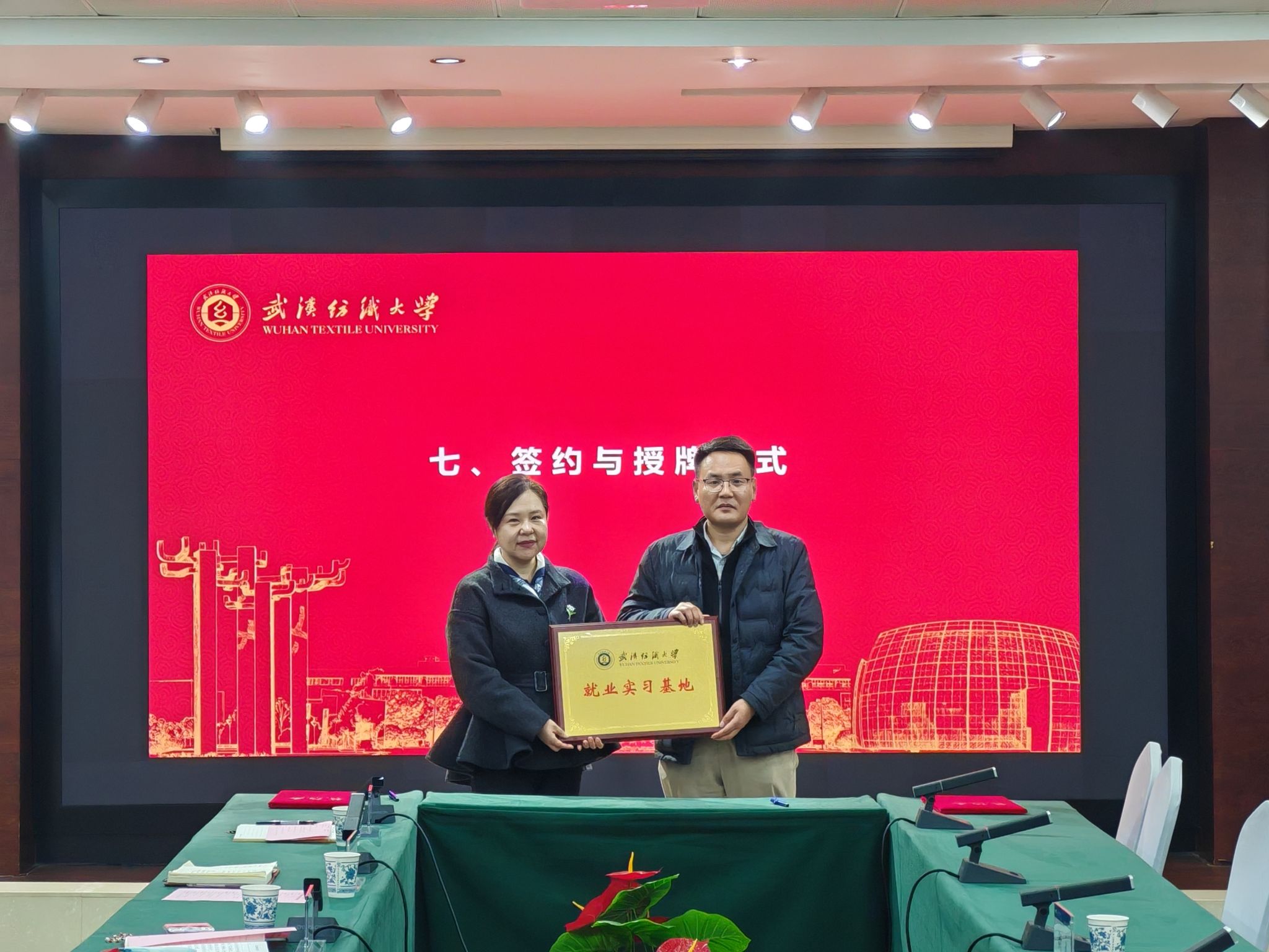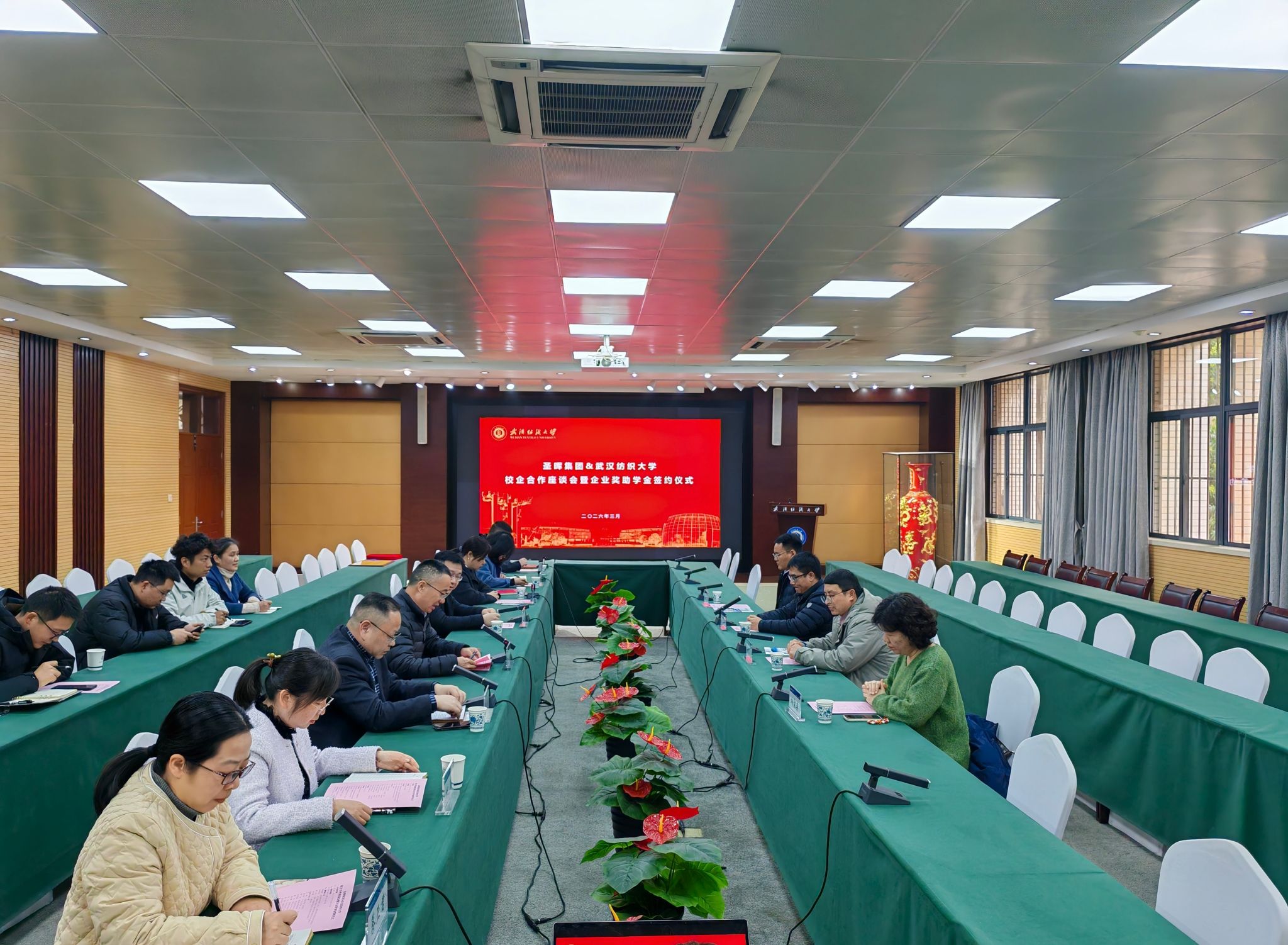 3月20日下午,圣晖集团与武汉纺织大学校企合作座谈会暨“圣晖集团奖助学金”签约仪式在阳光校区行政楼115会议室举行。圣晖集团协理周雄健、技术总监衡永作为校友重返母校共商合作,校党委常委、副校长王栋,学生工作部、就业中心、校友会负责人,资环学院、电气学院领导班子及师生代表共同出席活动。会议由资环学院党委书记郭俊主持。