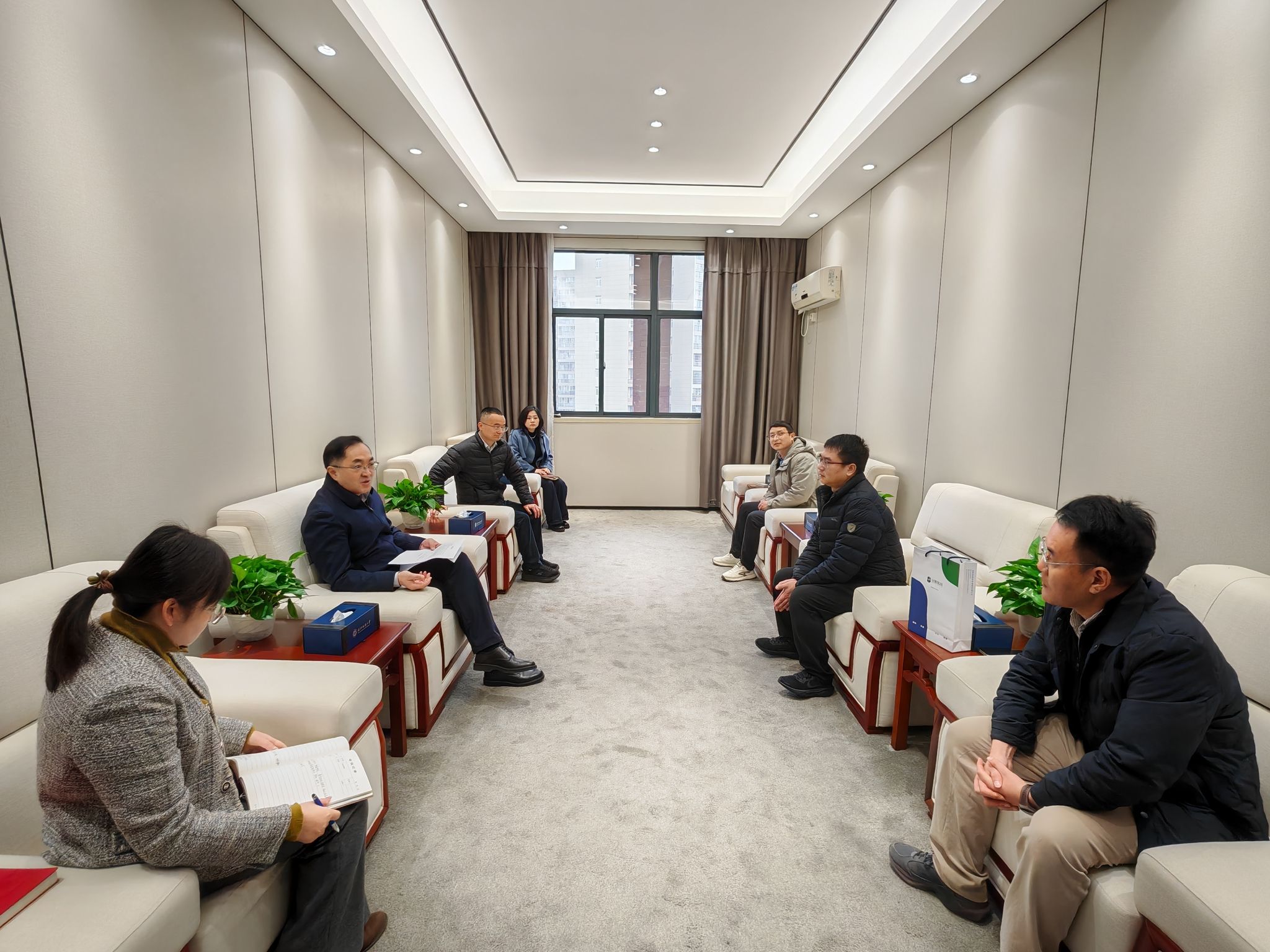 会前,校长傅欣亲切会见了圣晖集团、泛亚机电的校友。傅欣对位校友返校表示热烈欢迎,对他们长期以来关心和支持母校发展表示感谢。他指出,校友企业设立奖学金、共建实习基地,是校友对母校深厚感情的生动体现,也是深化产教融合的重要举措,希望双方以此次合作为契机,在人才培养、科研攻关、成果转化等方面开展更深层次的合作,共同助力学生成长和企业发展。周雄健表示,重返母校倍感温暖,感谢学校的培养和信任,圣晖集团将积极履行企业社会责任,用好校企合作平台,吸引更多纺大学子加入企业,实现校企共赢。