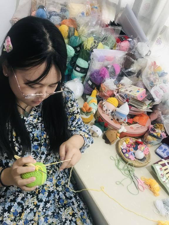 谈及为何没从事自己本专业、而想到“跨界”创业卖钩织品,梁祺睿说,这主要受家人的影响。妈妈从外婆那继承了钩织手艺,退休后除了照顾家里,便把全部精力用在钩织上。从小到大,梁祺睿见了很多妈妈制作的钩织品,小到袜子手套、大到帽子毛衣,而最让她难忘的,是夕阳西下,妈妈静坐窗前,毛线伴着收音机里飘出的悠扬歌声,像无数舞动的精灵,在她手里变作各种精美的艺术品。这样岁月静好的画面,使人内心特别平静,耳濡目染,梁祺睿也从小对钩织品产生了浓厚兴趣。