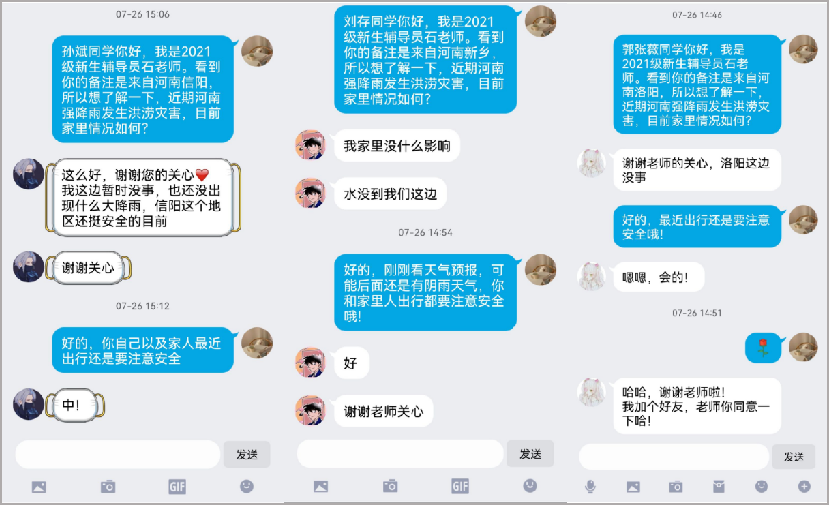虽未进校门,但已是一家人。学院将排查延伸到了2021级新生,石伊可通过QQ与河南籍新生一一取得联系,询问灾情、提醒出行安全,同时鼓励大家利用假期加强学习、充实自己。来自信阳的建环专业新生孙斌感动的说,“感谢学院的关心,没想到学院老师都这么好,中!”