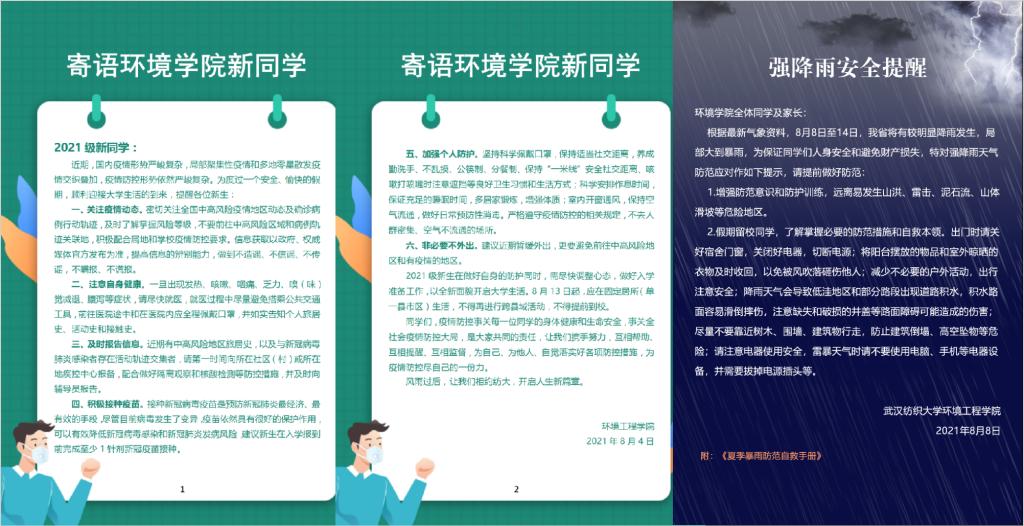 当前,国内疫情形势严峻复杂,局部聚集性疫情和多地零星散发疫情交织叠加,为提醒新生加强防护,确保按时健康入学,学院制作了《寄语环境学生新同学》《强降雨安全提醒》等海报,以公告形式发送至新生群,要求同学们点击公告确认收到。提醒大家关注疫情动态、及时报告信息、积极接种疫苗、加强个人防护、非必要不外出等,在条件允许的前提下,适当参与志愿服务活动,展现环境学子的责任与担当。