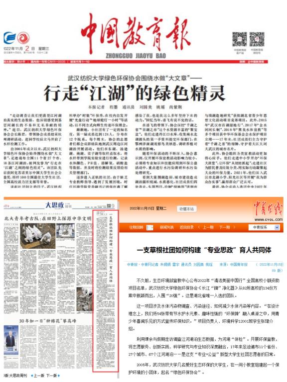 国家级媒体聚焦学院生态实践育人成效,外宣报道25篇。中国教育报以《行走“江湖”的绿色精灵-武汉纺织大学绿色环保协会围绕水做“大文章”》,中国青年报以《一支草根社团如何构建“专业思政”育人共同体》,中国青年网以《用青春守护长江:武汉纺织大学师生助力“长江大保护”》为题,报道学院思政协同育人模式;新增省级青年环境友好使者9人,省级长江大保护宣传员4人,省级社会实践优秀项目1项,武汉市最佳志愿服务项目1项,绿色环保协会荣获学校首届“五星”社团称号。