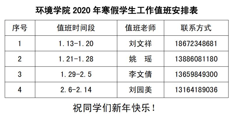 环境学院2020年寒假学生工作值班安排表