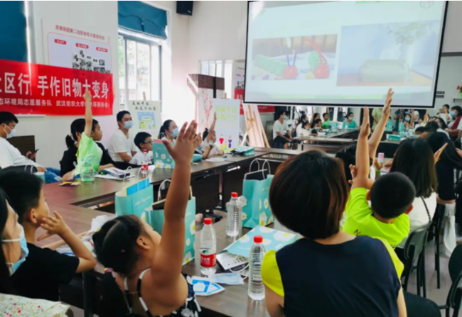 武汉纺织大学绿色环保协会志愿者化身环保小讲师,通过动画的方式引导孩子们了解地球的环境变化、废物利用的价值、低碳环保我们能做什么,现场气氛活跃,在问到生活中有哪些环境污染、垃圾如何分类时,孩子们抢着举手发言,大部分孩子都能完整地说出垃圾分类的种类。在旧物改造大变身环节,志愿者们将低碳循环理念融入亲子手作中,指导孩子们尽情发挥想象,和家长一起将家中废弃的饮料瓶、快递盒制成笔筒、小饰品、收纳盒等。活动现场还进行了环保DIY作品展,小朋友看到展品后,兴奋地猜起了作品改造的原材料。最后,获得环保勋章最多的3名小朋友获得生态童书一套。