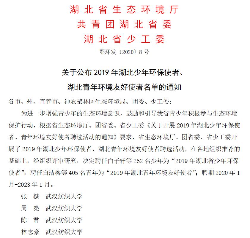 近日,湖北省生态环境厅公布了2019年湖北青年环境友好使者名单,绿色环保协会的张燚、周燊、陈君、林志豪等4位同学顺利入选,聘期为2020年1月-2023年1月。