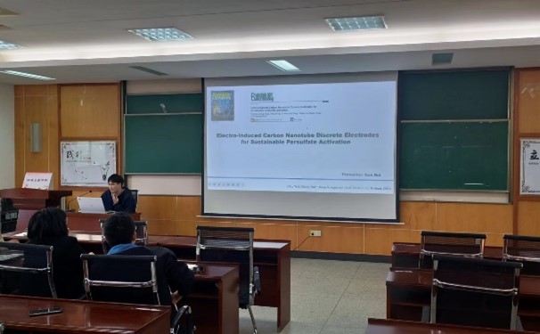 张钦源同学介绍了一篇文献,对纺织染色污泥(TDS)和废生物炭(BC)共燃过程中S和Cl的分布规律及其演化途径进行了量化。甘睿同学分享文献中报道的一项研究进展,该研究将传统石墨电极与分散的碳纳米管 (CNTs) 耦合,建立了三维电化学高级氧化体系 (EAOPs)。刘志雄同学则推荐了一篇关于UV/过氧二硫酸过程中自由基协同降解微污染物的动力学、理论模型和机理研究的文献。