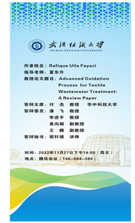 为提高研究生培养质量,加强研究生培养过程管理,我院于2022年11月27日举行了2022年硕士研究生(留学生)毕业论文答辩(秋季),留学生Rafique Ulla Fayazi(拉菲克)参与了论文答辩环节,答辩会邀请了华中科技大学环境科学与工程学院付杰教授担任答辩主席,并邀请多位相关学科学者(专家)担任答辩委员会成员。