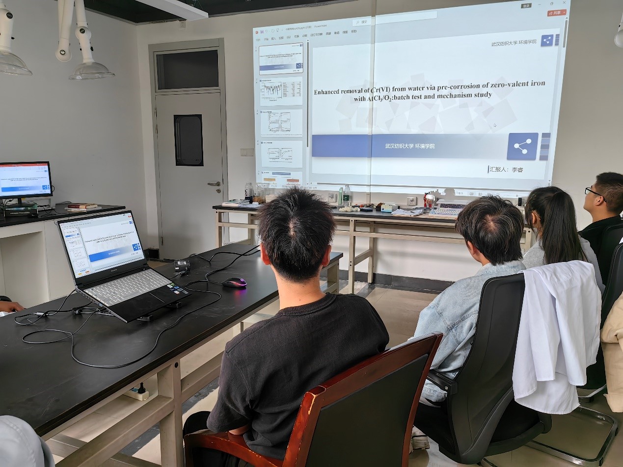 李睿同学分享了AlCl3/O2预腐蚀零价铁强化去除铬酸盐的相关研究,探究不同金属离子在富氧环境下与零价铁预腐蚀后去除铬酸盐的对比研究,并介绍了本学期的相关实验进展。