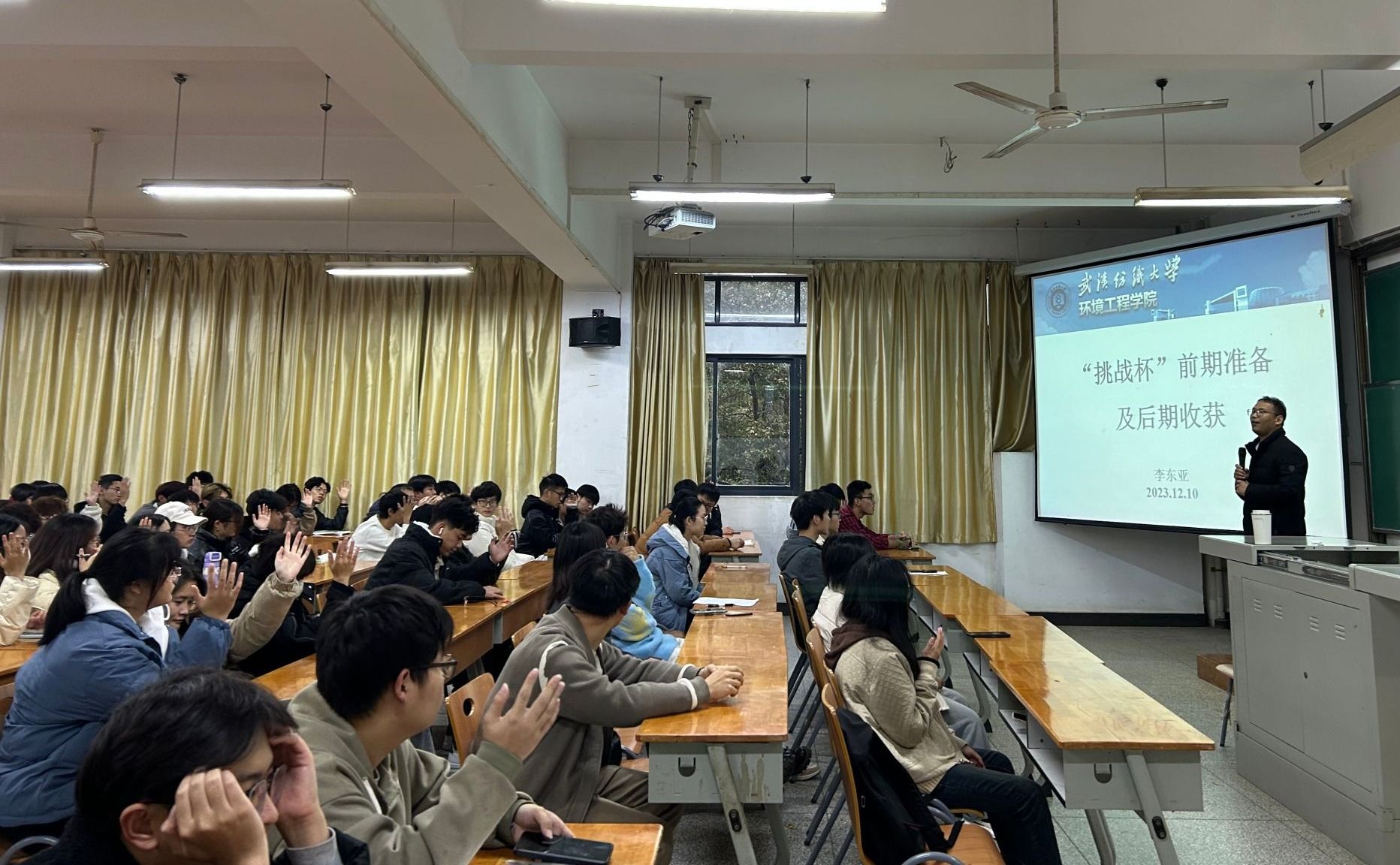 12月10日下午,2023年“挑战杯“全国特等奖作品指导老师李东亚老师为本科生作了“挑战杯前期准备及后期收获”为主题的报告。