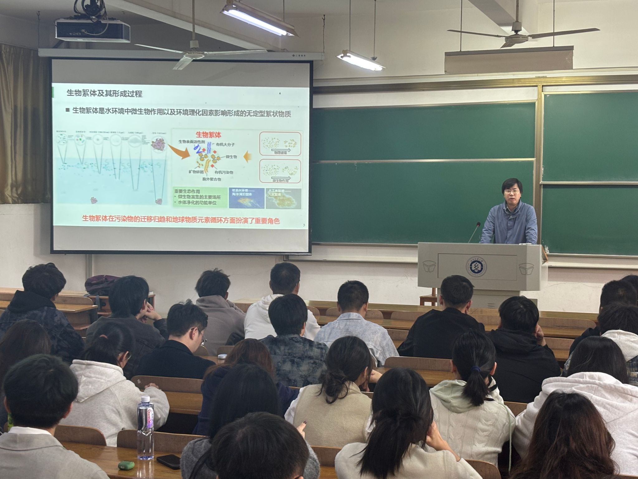 付杰教授从生物絮体及其形成过程和絮体在污染物迁移趋势的作用出发,从前期开展的4个方面的工作,系统的讲述了通过微生态系统与污染物之间的相互作用,强化生态修复和污染生物处理的过程。对“影响絮体形成的机制”、“调控微生物群落原理”和“微生物资源开发利用”三个科学问题进行了详细的报告。报告结束后,参会师生针对讲座内容进行踊跃提问,付杰教授对这些问题进行了细致解答。
