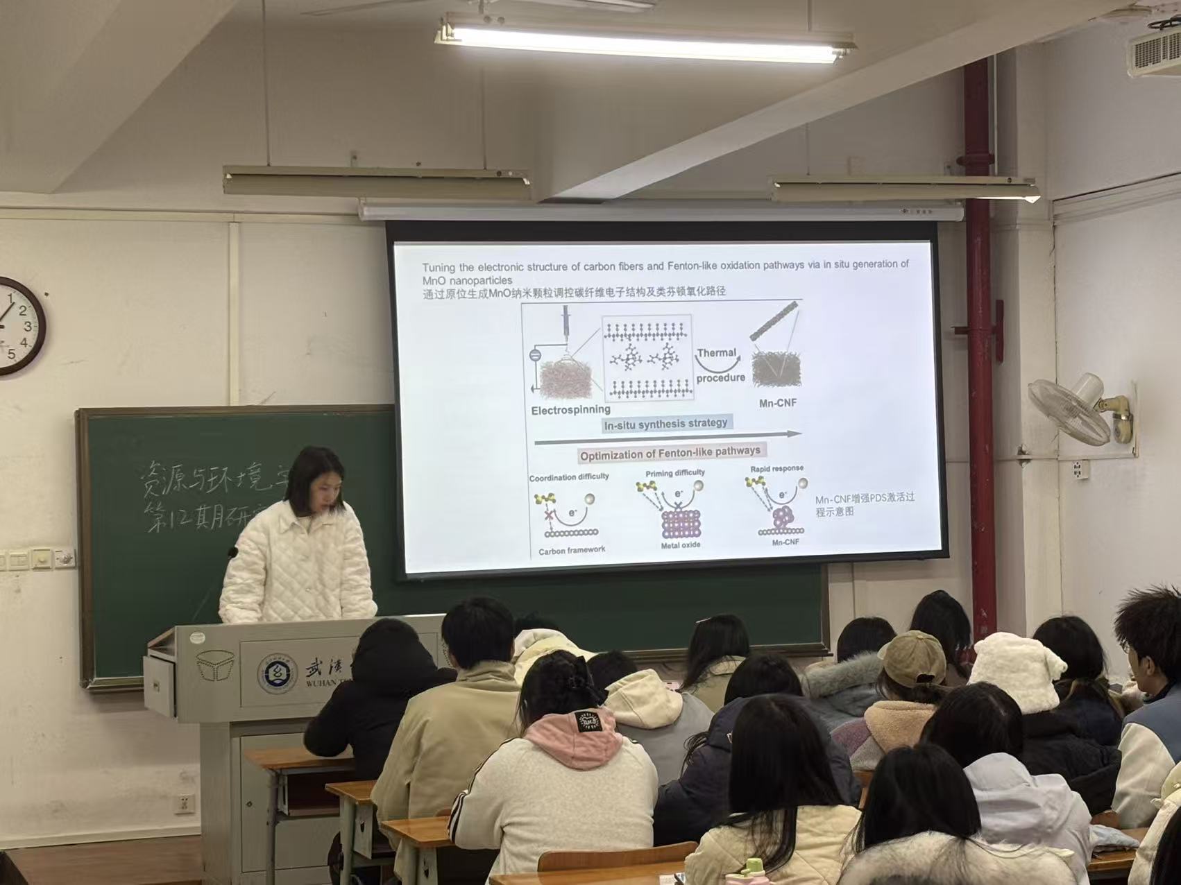李雪颖同学围绕“通过原位生成MnO纳米颗粒调控碳纤维电子结构及类芬顿氧化路径”展开,讲解采用原位合成法在碳纤维表面生成了均匀分散的MnO纳米颗粒,借助MnO与碳纤维间的界面相互作用,调控了碳纤维的电子结构,优化了类芬顿反应中电子的传输效率,同时改变了过氧化物的活化路径,提升了污染物降解的效率和选择性。