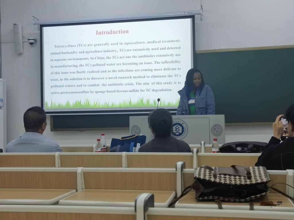 4月22日上午,与会人员认真听取来自全国纺织服装相关高校专家学者关于纺织服装专业研究生教育、人才培养的主题报告。4月22日下午,留学生Ngoulou在研究生论坛上做了题为“Peroxymonosulfate activation by sponge-based FeS material for efficient degradation of tetracycline: The critical role of sponge”,针对海绵基材料负载FeS降解典型抗生素四环素的性能及机理进行了介绍,与会老师就研究内容给出了相关建议。Ngoulou的报告荣获大会研究生论坛三等奖。