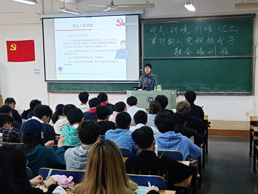 为提高入党积极分子的党性修养,做好学生党员的发展工作,献礼建党100周年。4月15日,环境工程学院、电子与电气工程学院、外国语学院、化学与化工学院四院联合第79期入党积极分子培训班在阳光校区崇志楼开班。按照疫情常态化防控工作要求,本次党校授课采用主会场+分会场直播形式开展,800余名学员参加了此次党校学习。