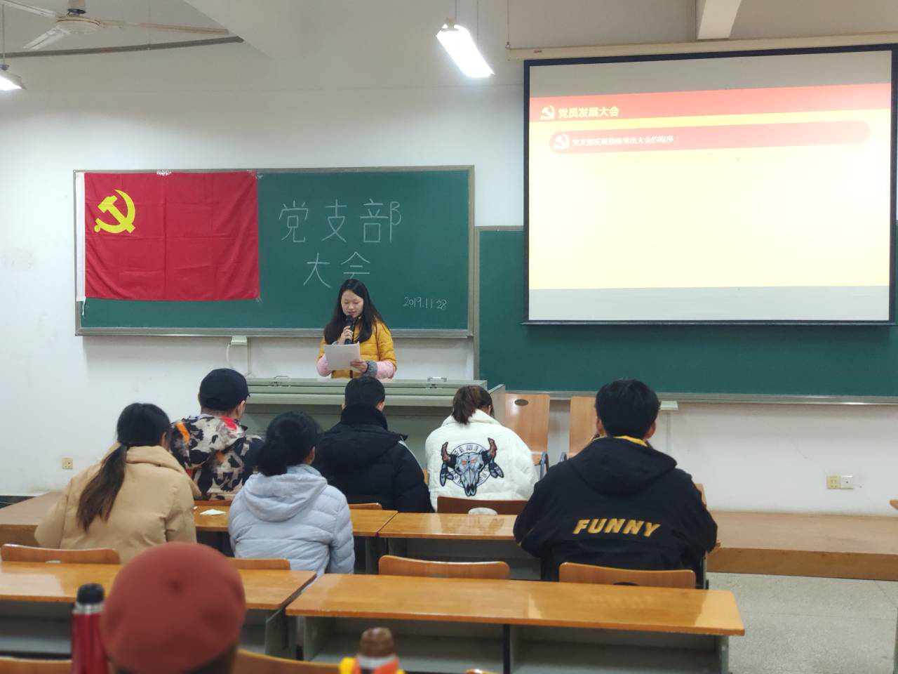 本次开展的是预备党员发展大会,主要议题为讨论谭威、李默涵等发展对象转为预备党员的决议。会议开始前,主持人进行了会议人员清点,并宣布到会情况,随后全体起立奏国歌,会议正式开始。先由发展对象上台宣读入党志愿书并陈述入党动机和入党后的规划,其后发展对象暂时离场,各支部正式党员对该名发展对象进行无记名投票表决,按此流程依次对各位发展对象决议。