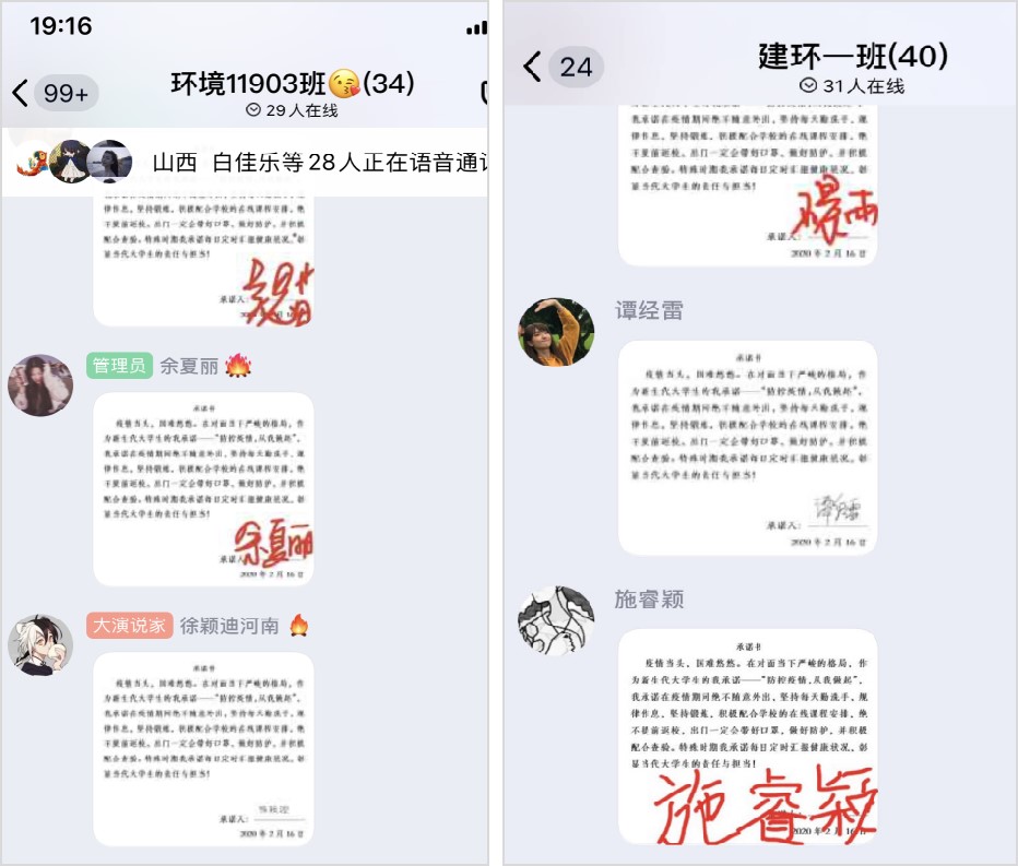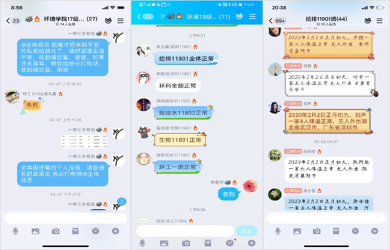 自第一天报平安起,环境学院学生打卡率一直保持100%。有位2019级同学的家长在群里动情的说:“老师们够辛苦的了,请大家多督促孩子按时打卡,让老师们少费点心”,日复一日的努力,赢得了家长和同学们的肯定。