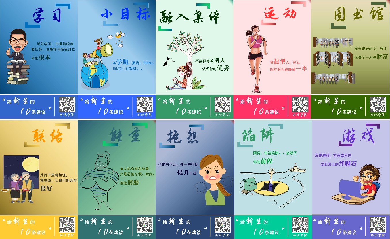 同学们踏进大学校门像一张白纸,四年间要在这张白纸上描绘美好的蓝图,必须系好人生的第一粒扣子。报到前,学院副书记刘园美用并不擅长的技术设计海报,对新生学习、生活、运动等提出了十条建议。