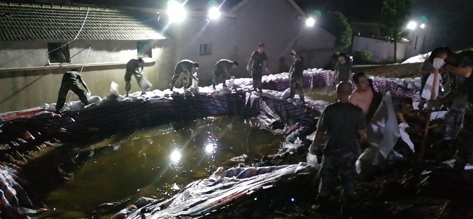 容不得半点耽搁,放下行李,我们直奔江堤。此时天色已晚,但堤上却灯火通明,一片繁忙景象,挖掘机紧张作业,挥舞铁锹、扛着沙袋的人流不断。看到这一幕,我不由的攥紧了双拳,迅速投入了战斗。铁锹与沙土的碰撞声,挖掘机发出的轰隆声,货轮驶过的鸣笛声……在夜幕下汇聚成一首催人奋进的战歌。铁锹此刻变得轻盈顺手,沙袋似乎也没那么沉重,我忘记了疲劳、忘记了饥饿,与其他民兵一道,从晚上8点半到凌晨两点,连续作业五个多小时,成功堵住了渗漏,并将数百米的堤坝用沙袋增高了一米,险情得以排除。