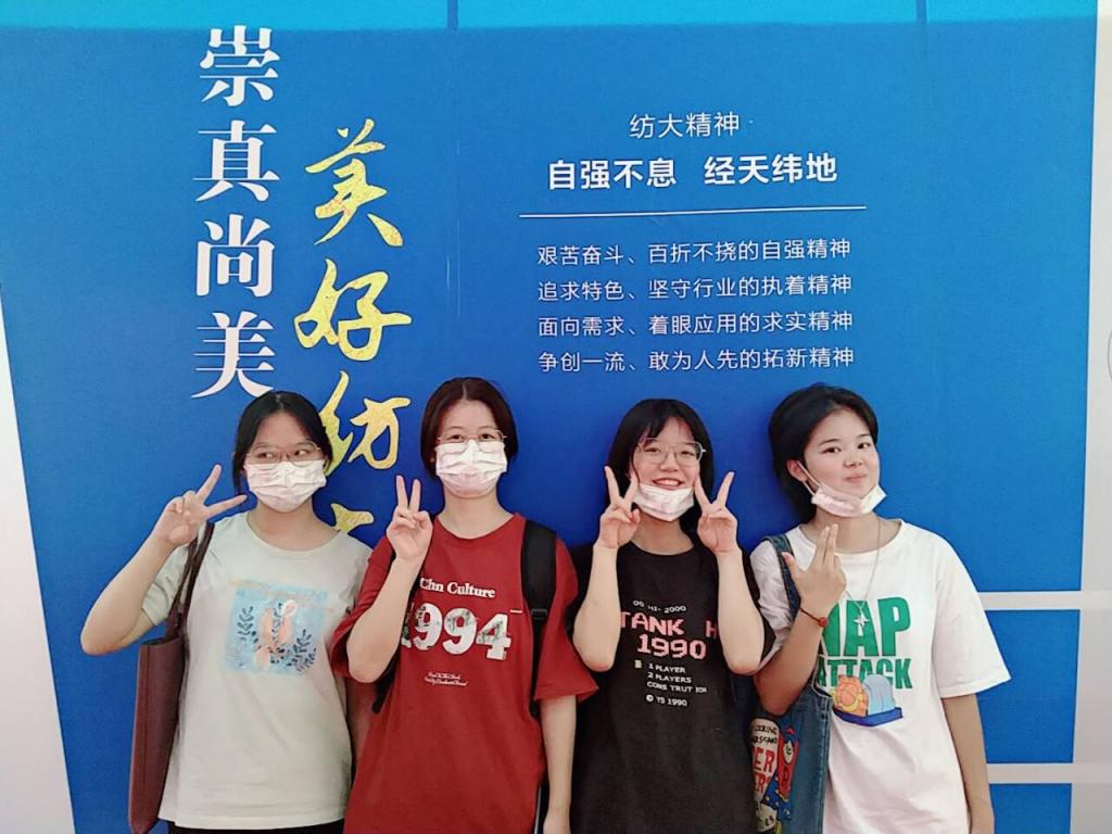 “崇真尚美,美好纺大,我们的大学生活从这里开始啦。”环境12103班王紫怡则开心的叫上室友在校训前拍照,留下与纺大的第一张合影。