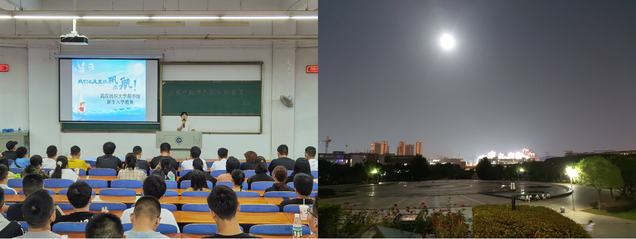 龚老师为同学们播放图书馆宣传片,生动展示了图书馆饱含人文气息的环境和丰富的资源服务。在“新生第一课”专题书架,她郑重向大家推荐具有纺大特色专业、大学生活与成长规划以及文学、哲学社会科学、自然科学类经典书籍。给排12102班张程沥晚餐后就前往图书馆参观学习,并拍下照片附言“明月高悬,美在纺大”。