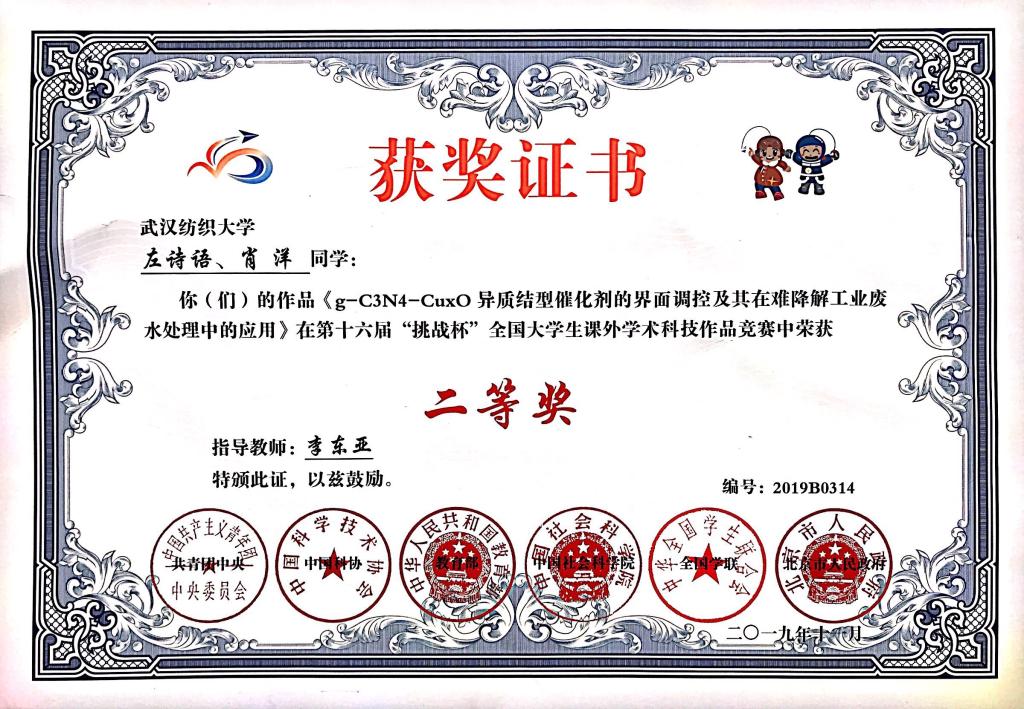 随着研究工作逐步深入时不时也会遇到各种困难总是选择直面挑战每一次的失败往往会激发他更强好胜心,一次次得出失败的数据,一次次进行经验总结,一次次改变攻克思路,都会换来一次次的新发现。研一的时候,为打破非均相催化在复杂水处理中应用的瓶颈,解决非均相反应表界面过程限制的问题。他基于电子结构的认识优化d轨道分布,优化反应中间体的解吸附过程,把先前研究的极化电场体系优良的电子特性,以简单的工艺构建定向内建电场作为电子传递通道,克服自由基/非自由基反应的电子得失限制,为高效、持续、稳定地在复杂水环境中催化降解有毒有机污染物提供了可行的方案相关研究论文在权威期刊发表,授权国家发明专利,成果获得“挑战杯”湖北省特等奖、全国二等奖