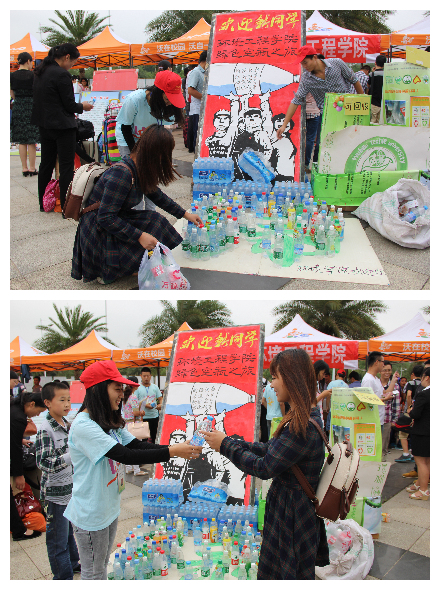 为了倡导“资源循环”的环保理念,增强新生的环保意识,环境工程学院的学生想出了这个创意。活动一开始,就得到了学生和家长的热烈欢迎,吸引了大量的新生和家长前来兑换。“学姐,请问一下你们这个活动怎样进行的啊?我把这2个喝完的矿泉水瓶给你们就可以换一瓶新的矿泉水吗?”一位新生拿着刚喝完的饮料瓶问道。“是的,喝完水的瓶子不要扔掉了,可以兑换新的矿泉水,我们积攒的矿泉水还可以兑换绿植送给大家。”迎新点的学姐陈雨婷给这位学妹详细地解释道。“哦,那真划算,还可以资源循环利用呢。”一位学弟说道。