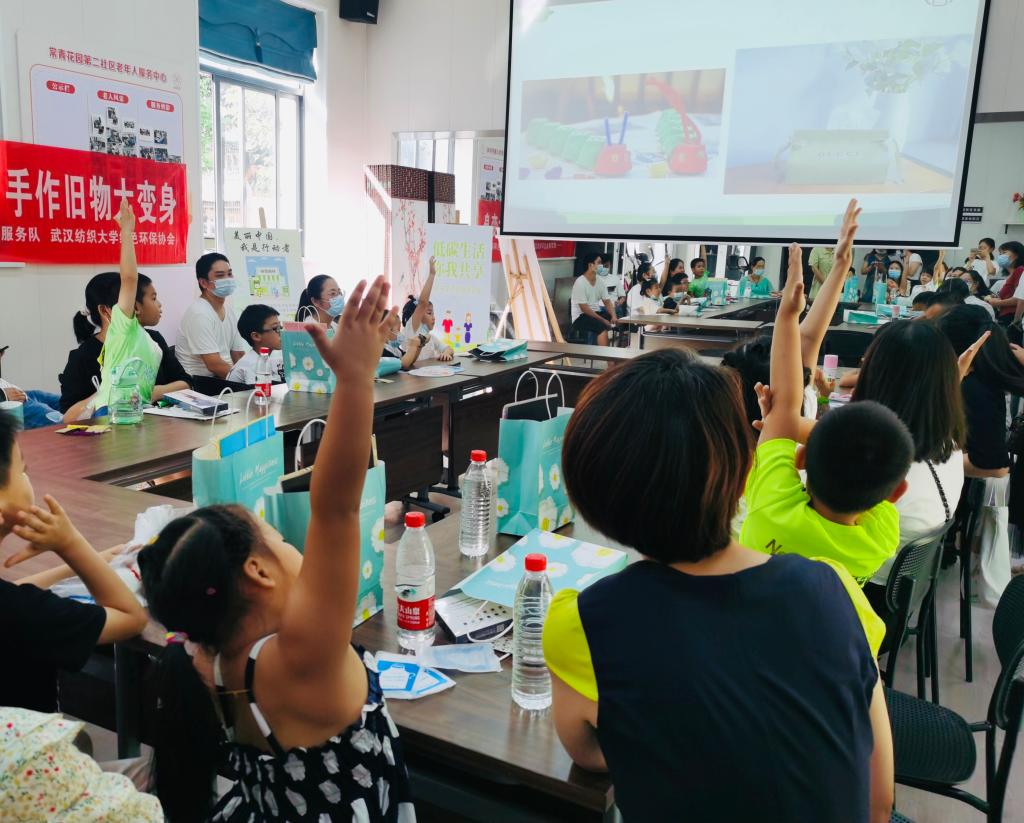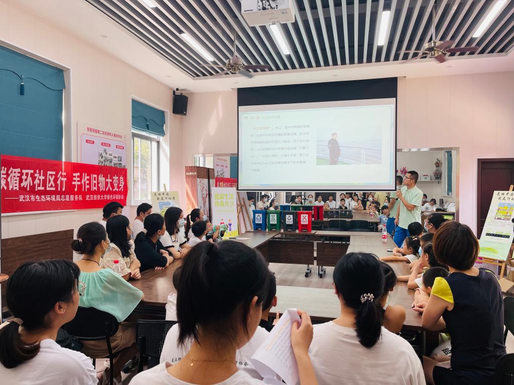 本次活动的主题为“低碳循环社区行,手作旧物大变身”,武汉市生态环境局志愿服务队、长江生态环保宣讲员金宪琦老师从“关注生态环境”到“共建美丽中国”,从“碳达峰、碳中和”到争当生态环保志愿者,为现场的孩子和家长们科普当前生态环境保护的热点、重点和难点,号召大家节约能源、低碳出行,做环保实践的参与者,做生态环境的监督者。