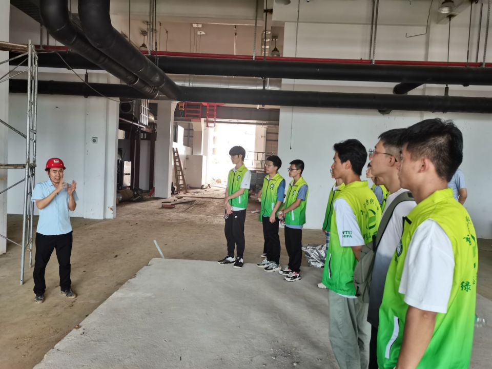 第四站,实践队走访了中法生态城启动区能源站,被誉为“空气源恒温大空调”,该站是蔡甸区第一个碳中和能源站。湖北工业建筑集团黄威向实践队员们讲解了“零碳排放”能源站主要运用了空气源热泵+屋顶光伏系统+燃气三联供系统+离心制冷机+燃气锅炉系统的多能互补方案,实现绿色零碳的夏天供冷,冬天供热,为中国实现碳达峰碳中和给出了可复制,可持续的实施方案。实践队员杨润杰感叹到:“从‘零碳’的建筑理念,到建成后由调控中心的统一调配,以及内部的各类庞大器械之间的协同运转,让我看到了能源站拥有一套完善的零碳能源智慧系统,感受到了现代科技的魅力,也对打造绿色零碳生活更有信心!”