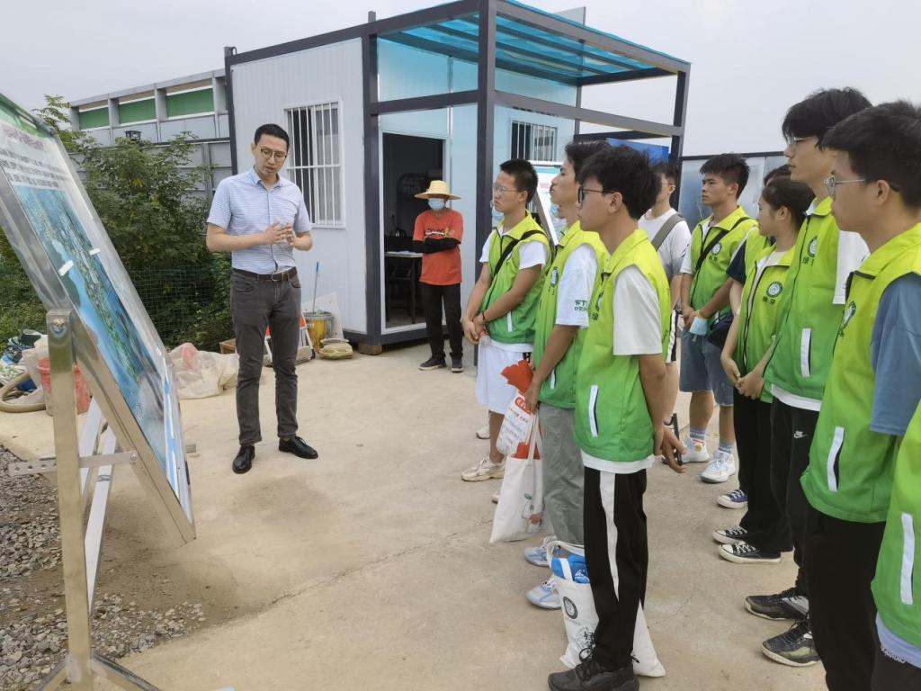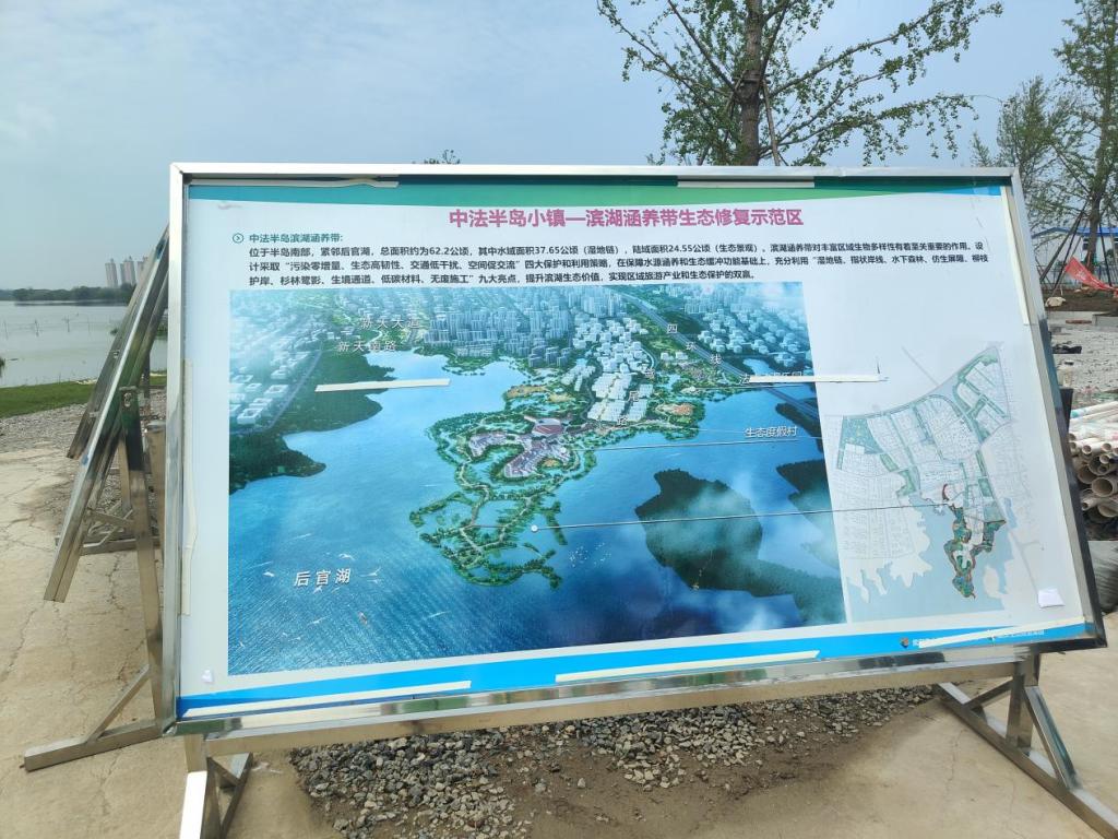 实践队首先实地走访了中法半岛小镇滨湖生态涵养带,中法生态城土地规划建设处李秭尧主任向实践团成员介绍了小镇的发展规划,描绘了中法半岛小镇建成的美好景象。他重点介绍了中法半岛生态滨湖生态涵养带将作为《湿地公约》第十四届缔约方大会示范区之一,在滨湖生态涵养湿地系统重新构建完成后,会实现后官湖污染“零排放”,让滨湖生态之美可观,可听,可感。