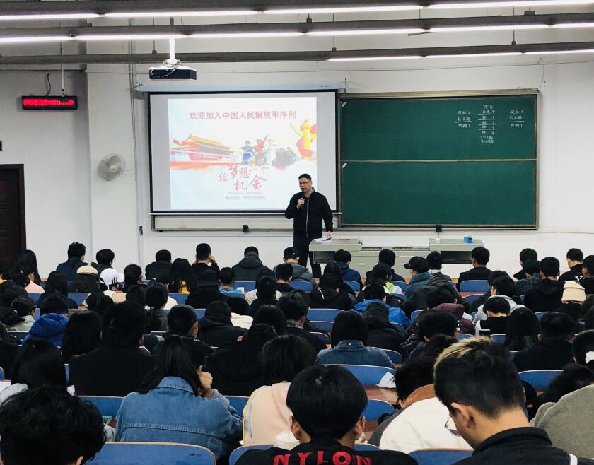 为全面贯彻党的十九大精神,深入学习习近平总书记给新入伍大学生的回信精神,为增强学生国防意识,激发大学生参军入伍保家卫国情怀与热情,11月24日,环境学院在3教T201教室开展了爱国主义教育和2020年征兵动员。