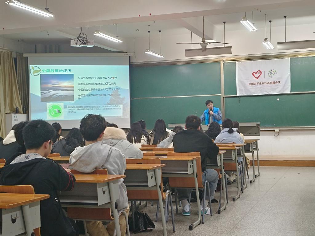在活动期间,服务队志愿者们组成宣讲团,围绕“湿地科技与湿地经济”等主题,向同学们讲述前沿湿地科学技术案例。